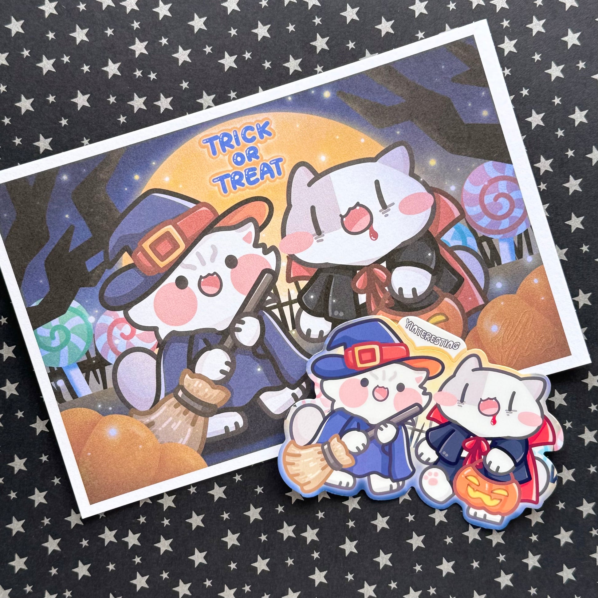 - Sticker: 1x Halloween Trick or Treat Cats Stickers Size about: 2.2"H x 3.2"W