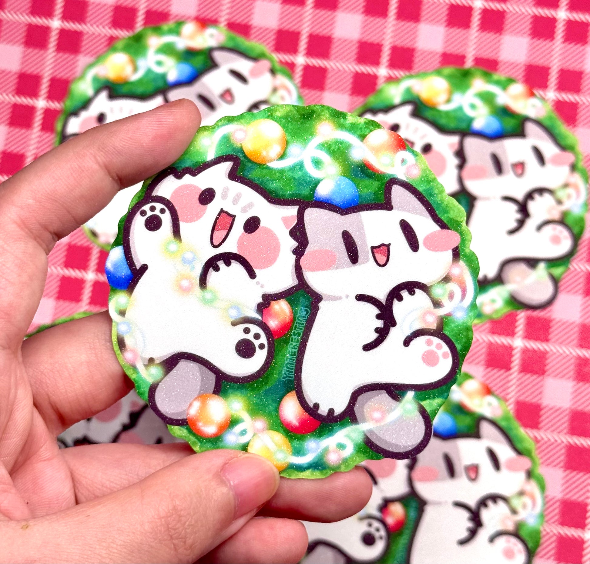 - 1x Meows playing with Christmas Lights sticker Size about: 3"H x 3"W